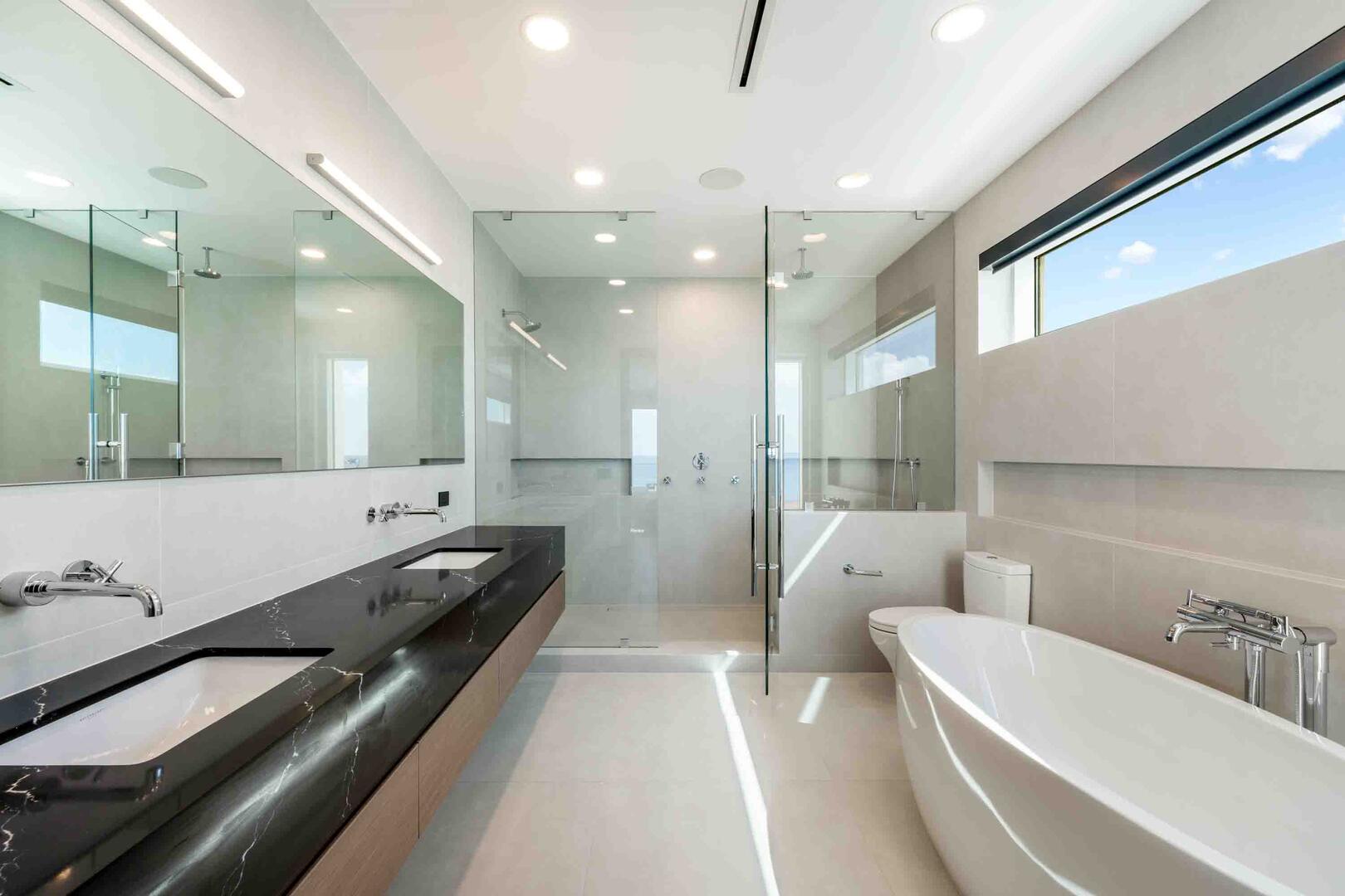 Bedroom 1 ensuite equipped with dual vanity, soaking bathtub and separate double shower.