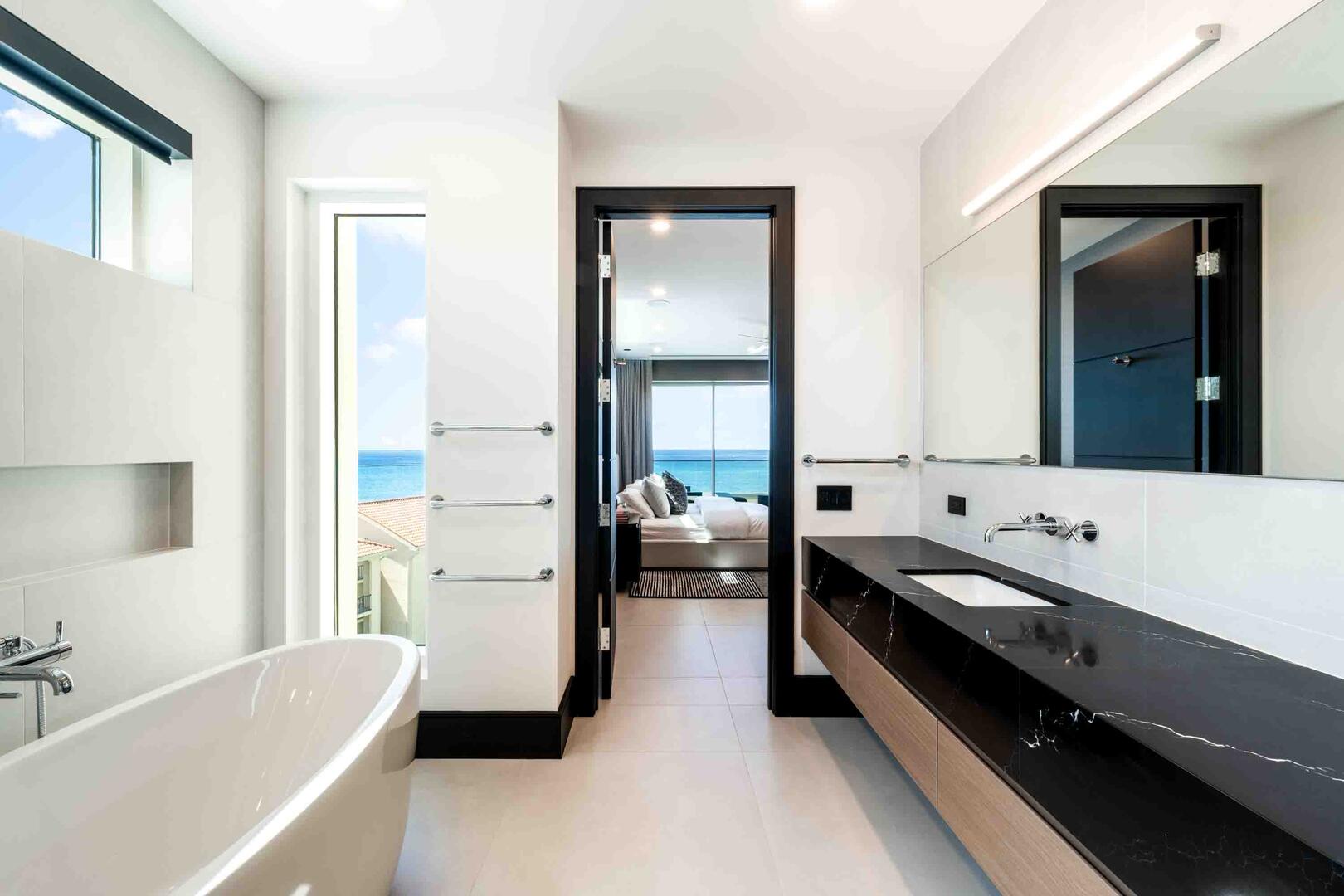- Bedroom 1: primary suite, king bed, oceanfront views, television, walk-out access to the ocean balcony, walk-in closet, ensuite with dual vanity, soaking bathtub, and double shower.
